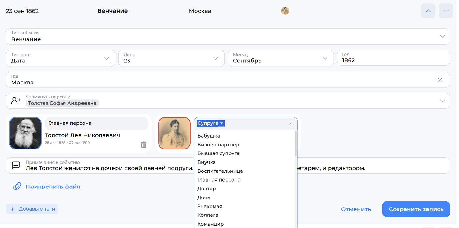 Если участников события несколько и они указаны в родословном древе, вы можете упомянуть их при заполнении информации о событии. В таком случае событие отобразится в расширенных карточках всех отмеченных вами участников.