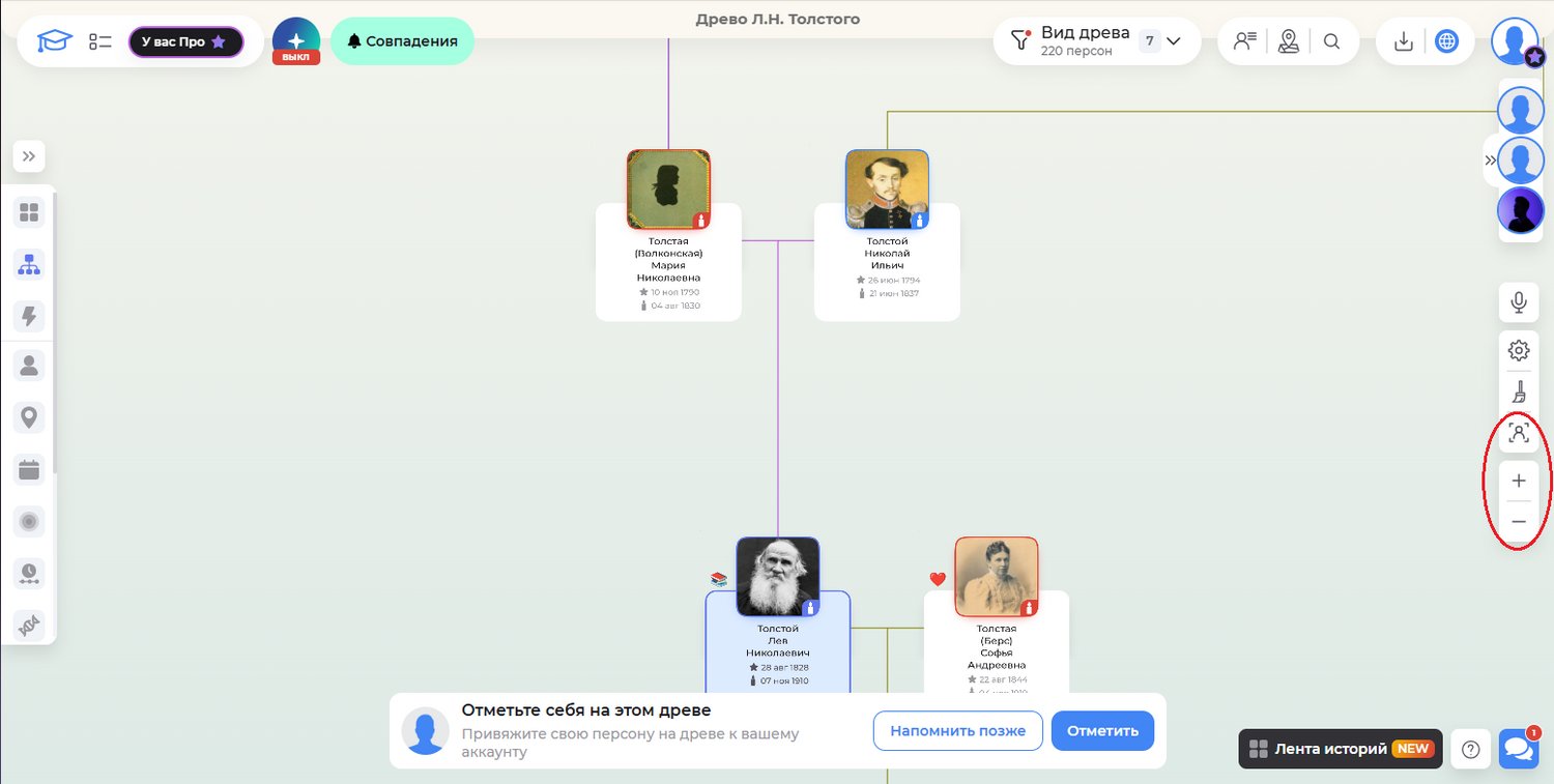 Для удобства просмотра и заполнения родословного древа вы можете изменять его масштаб — увеличивать или уменьшать, в зависимости от запроса. Увеличение и уменьшение масштаба можно производить с помощью кнопок зумирования «+», «−».