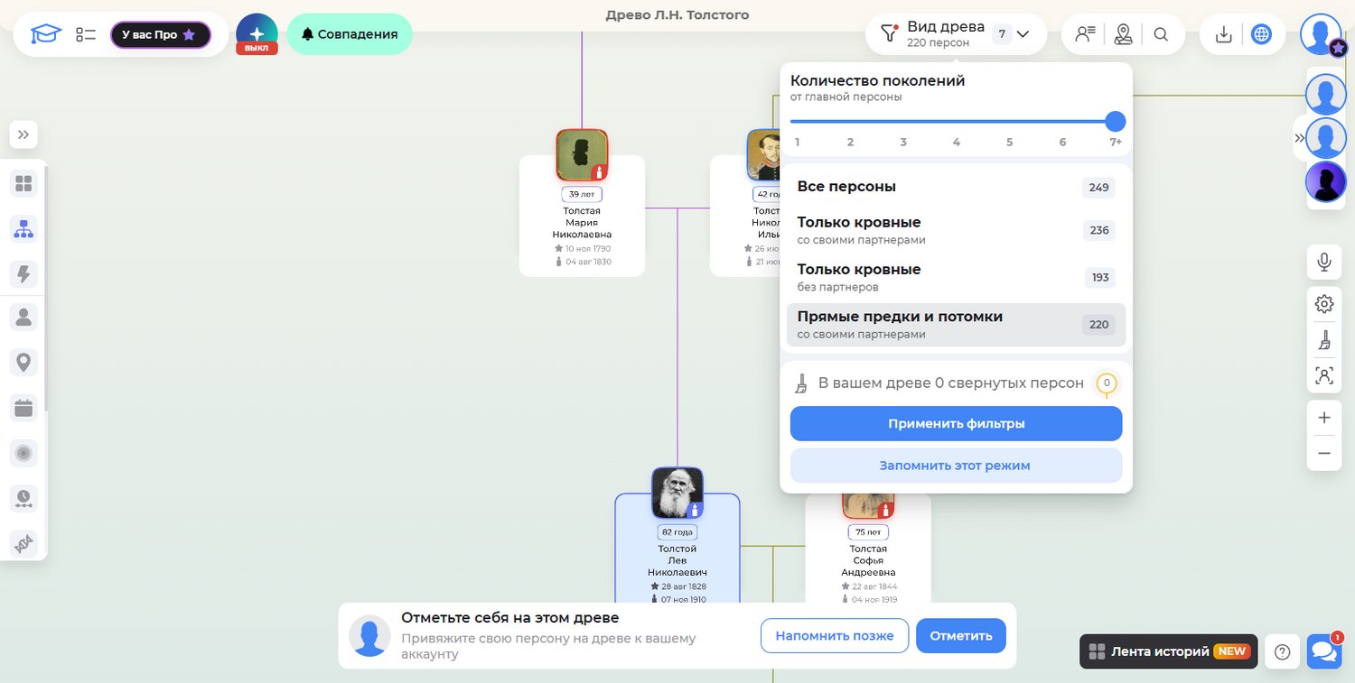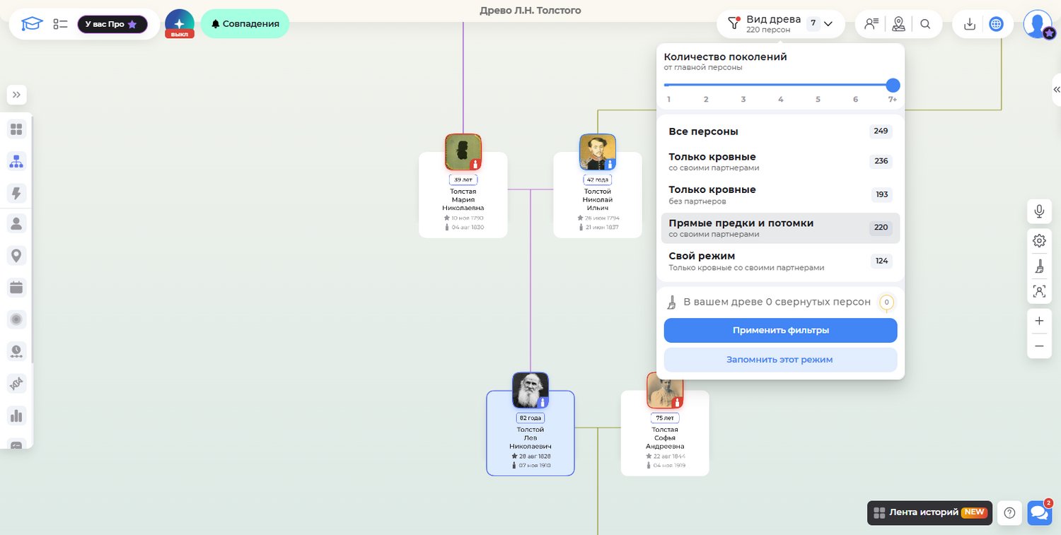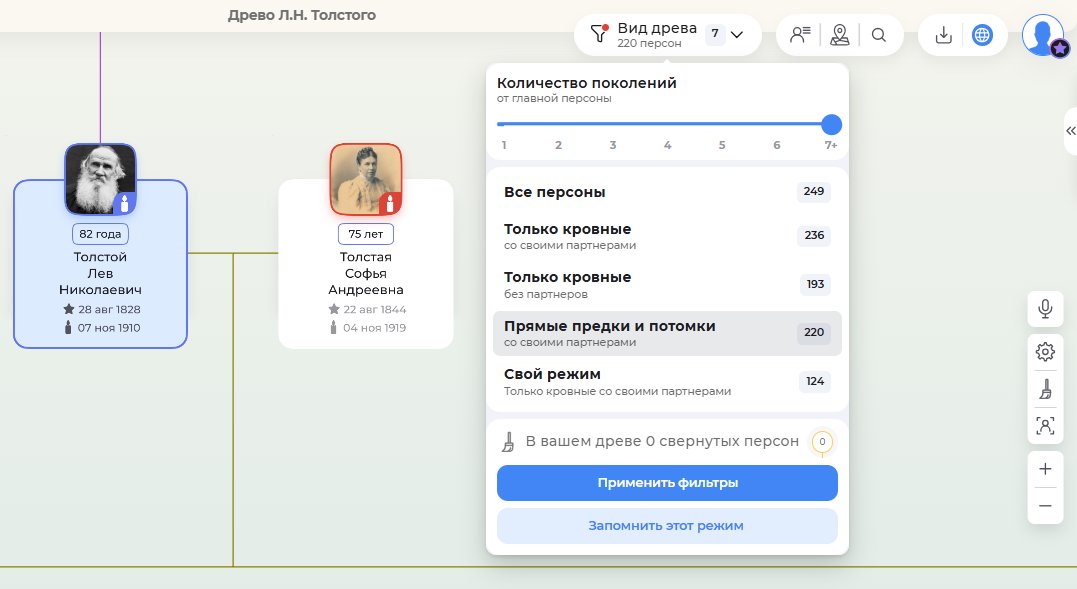 Чтобы выбрать удобный для вас формат отображения персон, необходимо в выпадающем списке на панели управления выбрать соответствующую категорию и нажать «Применить фильтры». Древо перестроится согласно выбранному режиму.