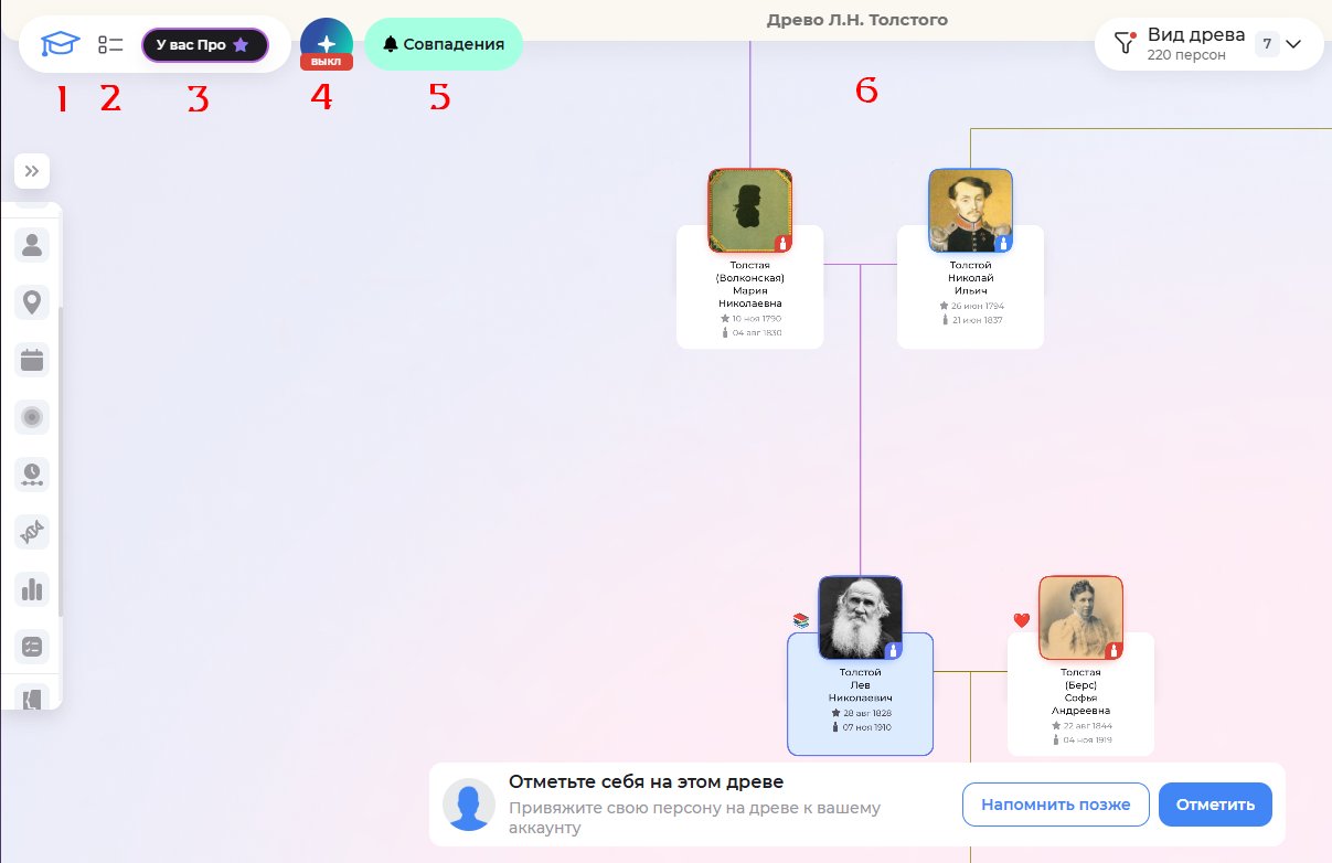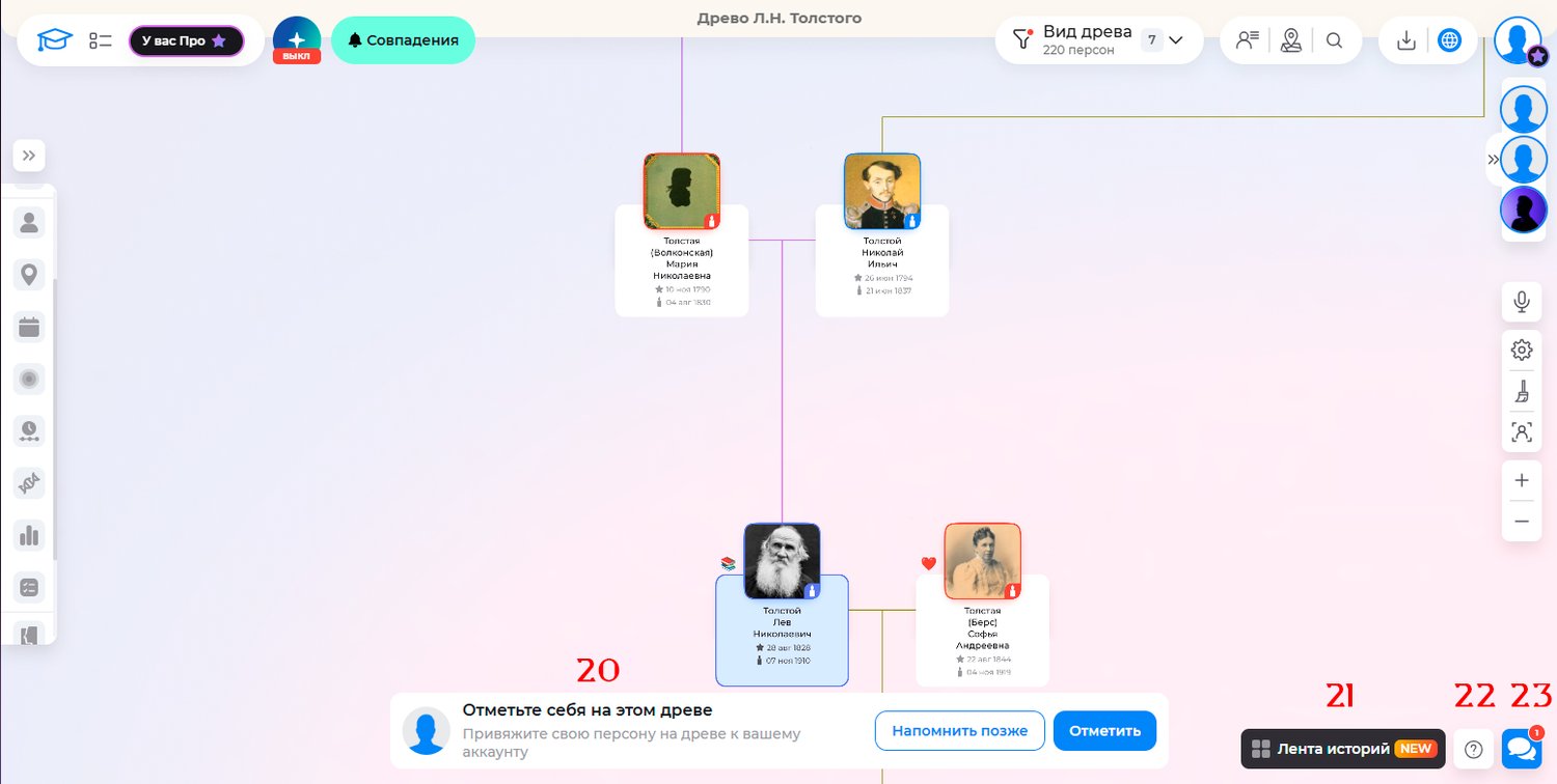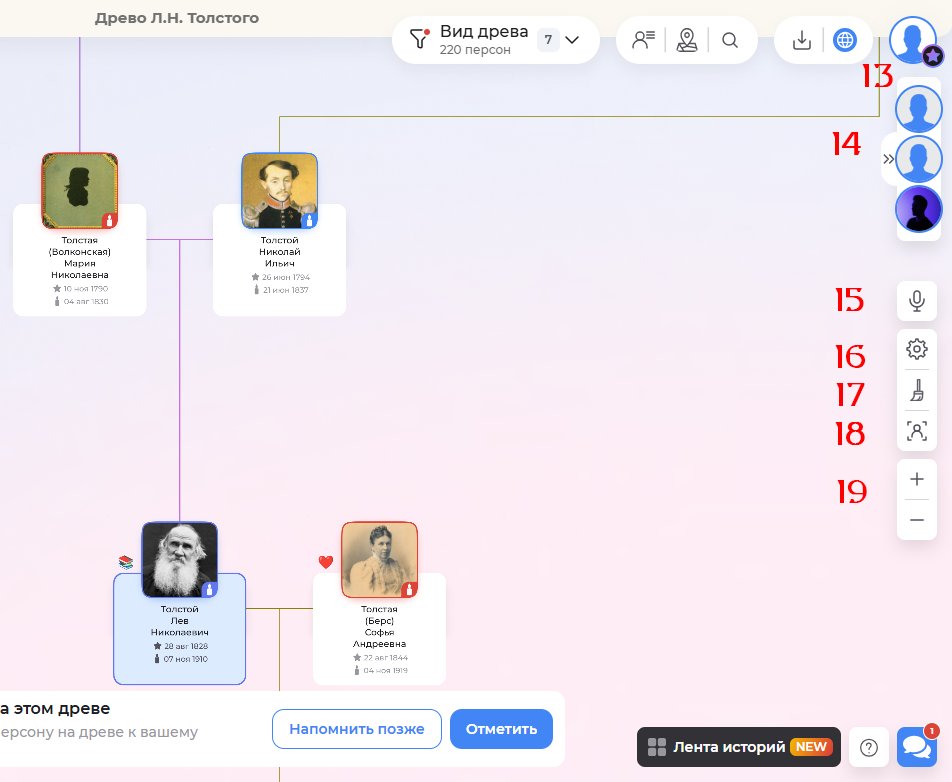 Ознакомиться с тем, как устроена панель инструментов доски древа в мобильной версии, можно в руководстве по работе в сервисе Famiry с мобильного устройства.