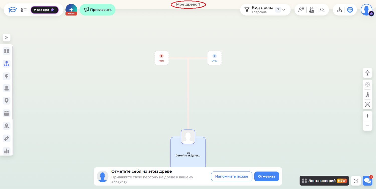 При создании нового древа название устанавливается автоматически по типу «Мое древо 1», «Мое древо 2» и т. д. При желании вы можете его переименовать, добавив свое уникальное название для древа в вашем аккаунте.