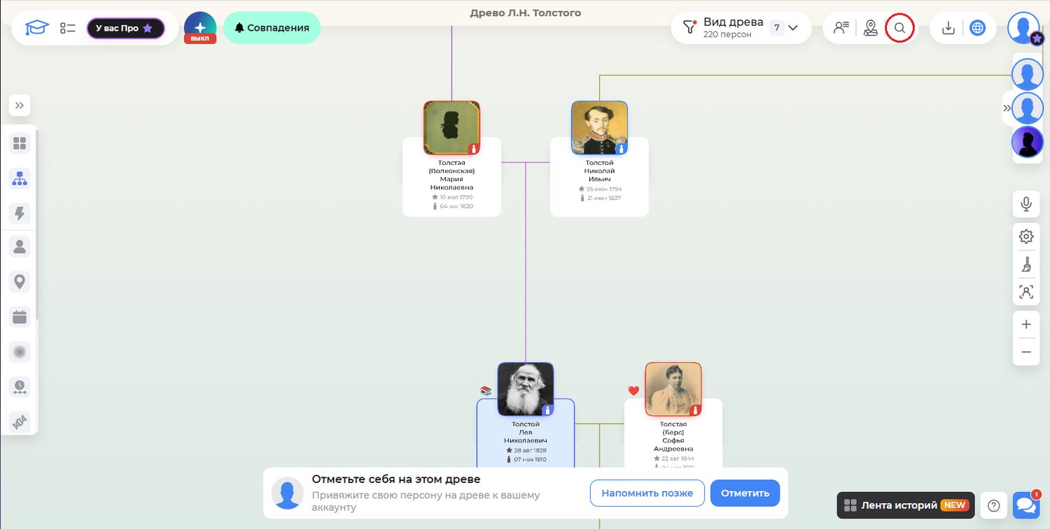 Чем больше становится ваше родословное древо, тем больше времени занимает поиск на схеме конкретной персоны. Чтобы быстро найти необходимую персону, вы можете воспользоваться функцией поиска. Для этого нажмите кнопку «Поиск» на панели инструментов и в поисковой строке начните вводить имя интересующего вас родственника.