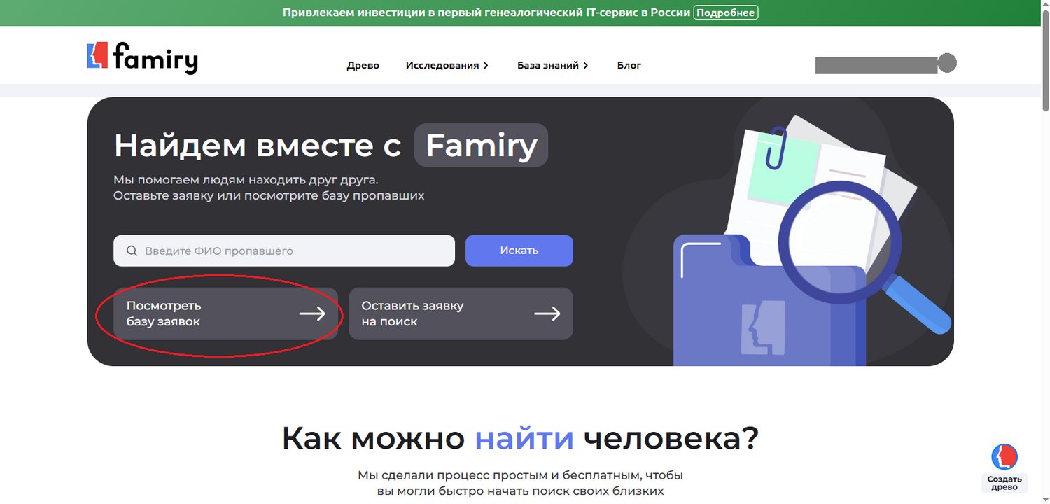 Зайдите на главную страницу сервиса Famiry. Нажмите на «База знаний» и в выпадающем окне выберите «Поиск людей».