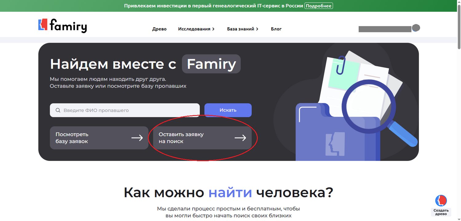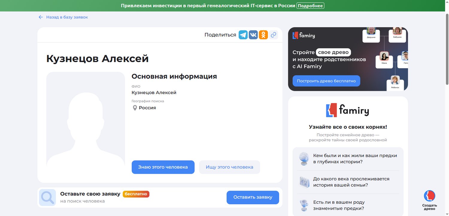 В Famiry работает сервис по поиску людей «Найдем вместе». Его суть в том, что любую персону из древа можно разместить в публичном каталоге поисковых заявок в сервисе Famiry, который посещают более 1 млн человек в месяц. Кроме того, в отличие от вашего древа, которое закрыто от посторонних, эта база индексируется. Благодаря этому увеличиваются шансы на то, что кто-то увидит и узнает искомую вами персону, в том числе волонтеры.