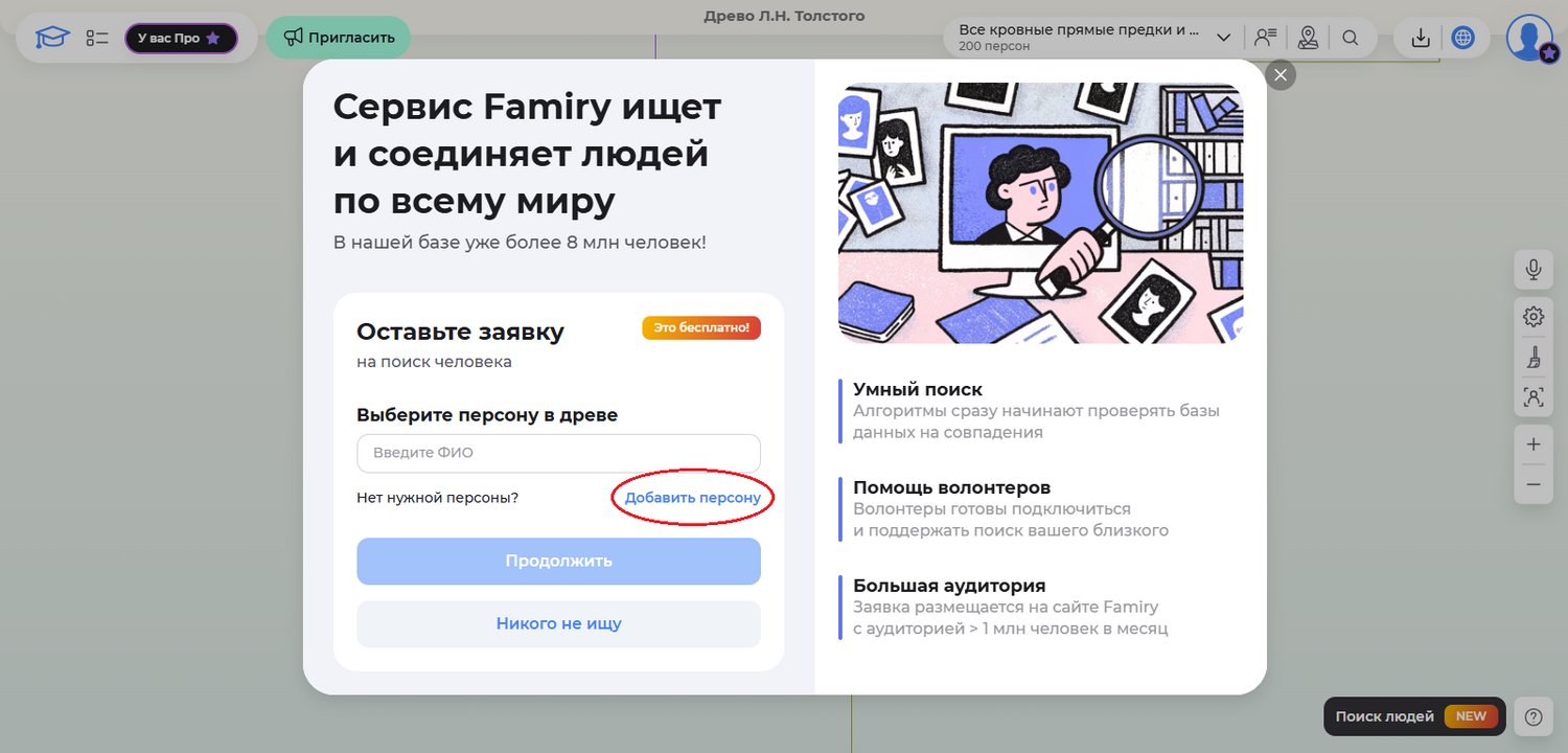 Если в древе нет нужной вам персоны, откройте форму «Поиск людей» и нажмите кнопку «Добавить персону».
