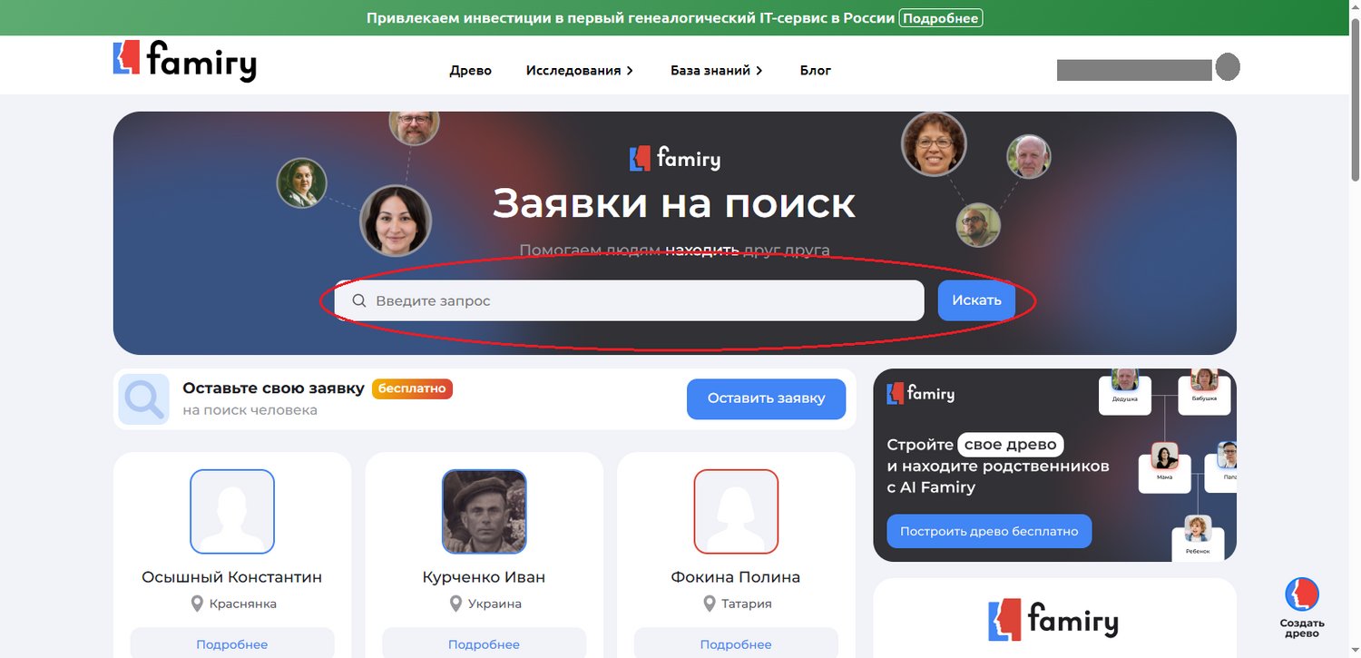 Для самостоятельного поиска персон зайдите в раздел «Поиск людей» в «Базе знаний» на главной странице сервиса Famiry, введите ФИО пропавшего и нажмите кнопку «Искать».