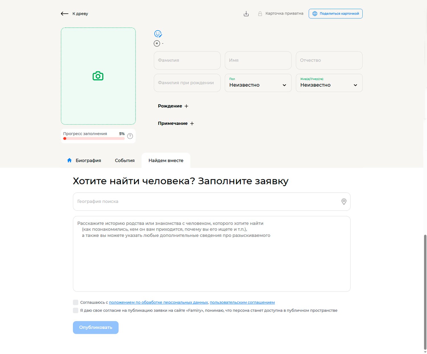 Откроется страница с полями для заполнения. Заполните все известные вам данные о персоне и отправьте на публикацию.