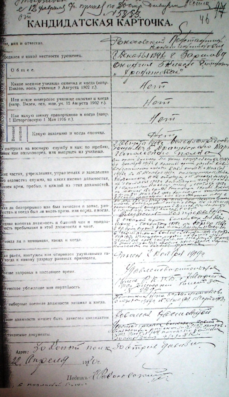 Кандидатская карточка Константина Константиновича Рокосовского. 22 апреля 1920 г. / Источник: рувики (ruwiki.ru/wiki Рокоссовский,_Константин_Константинович)