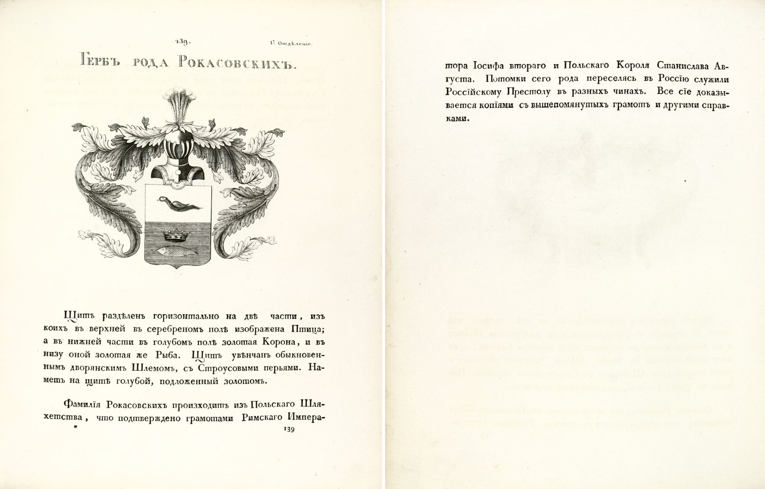Герб Рокасовских. Общий Гербовник дворянских родов Всероссийской Империи, начатый в 1797 году. Часть IV. СПб., [1799]. Стр. 139