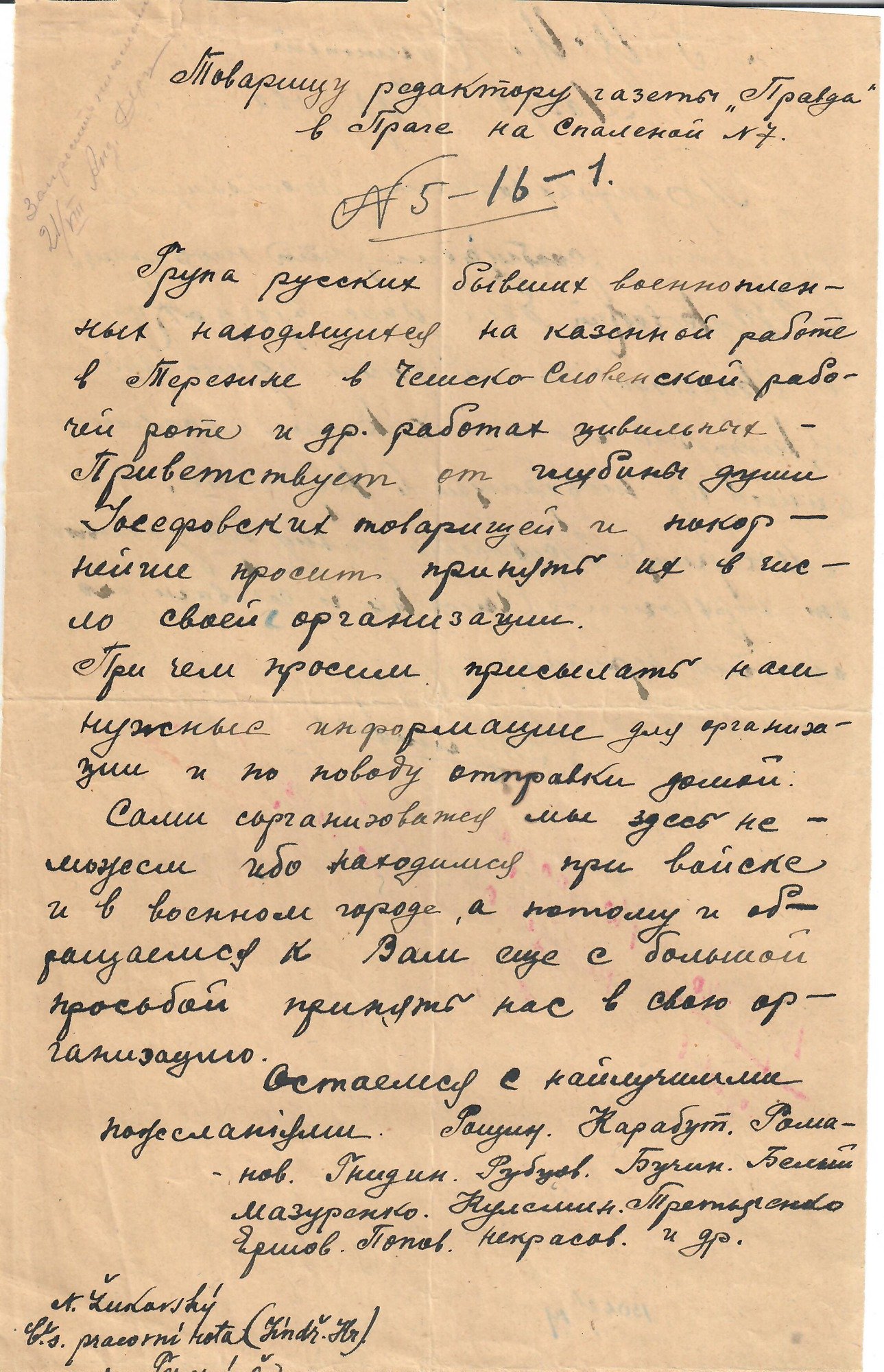 Письмо группы русских бывших военнопленных в Терезине редактору газеты «Правда» в Праге. Источник: ФГБУК «Государственный центральный музей современной истории России» (sovrhistory.ru)
