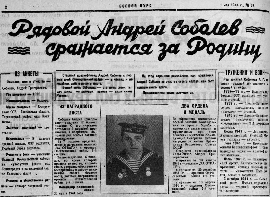 А иногда в газетах вместо литературных очерков печатались выдержки из документов бойца (видимо, в тех случаях, когда информацию дать было необходимо, а лично встретиться с героем у корреспондента по каким-то причинам не получилось). И это настоящий клад для генеалога. Например, в газете «Боевой курс» (краснофлотская газета Северного флота) за 1 мая 1944 года целая страница посвящена старшему краснофлотцу Андрею Соболеву: кроме фото, даны выдержки из его анкеты, трудовой книжки, наградного листа, рекомендации в ВКП(б) и проч., а также приведена переписка с матерью. Возможно, такая же информация собрана в какой-либо газете и о вашем родственнике.