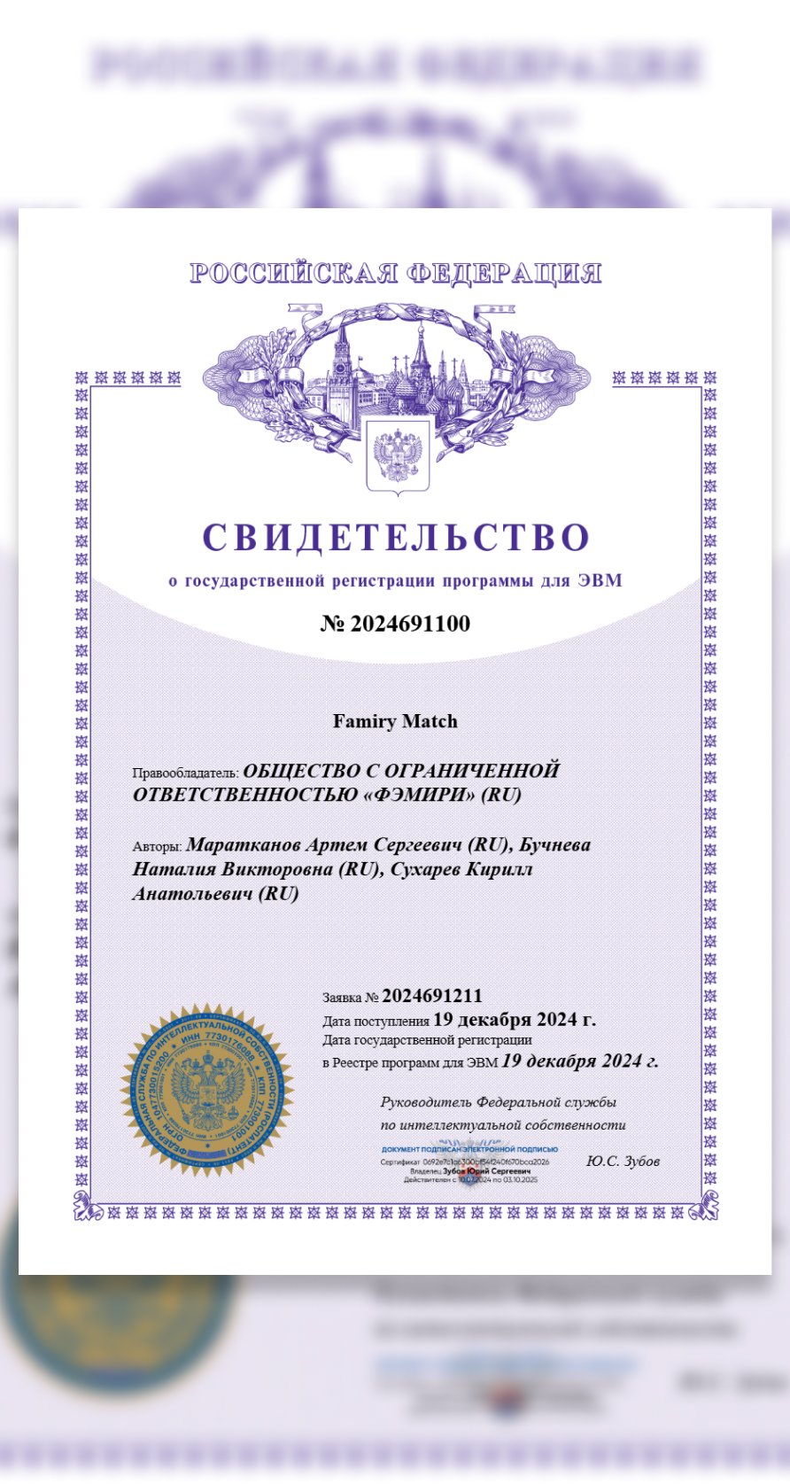 Свидетельство о регистрации алгоритма поиска совпадений сервиса Famiry в Федеральной службе интеллектуальной собственности