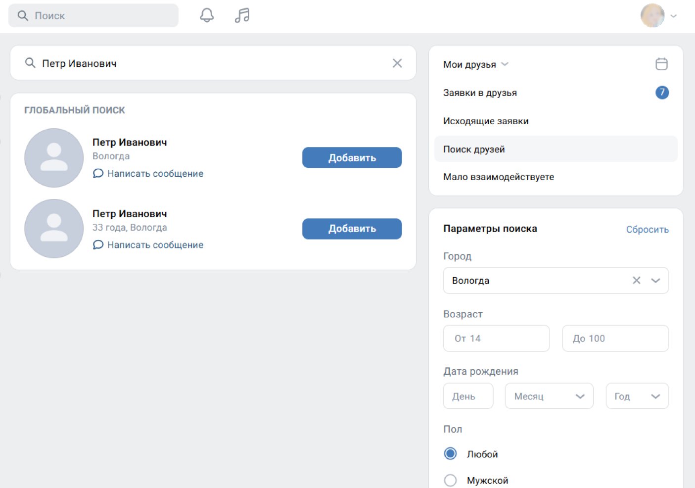 Поиск родственников в соцсети ВКонтакте по ФИО и месту жительства