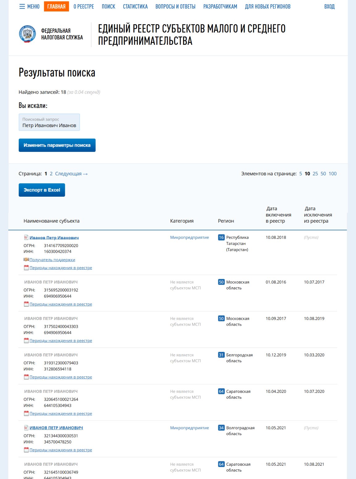 Результаты поиска по ФИО в Едином реестре субъектов малого и среднего предпринимательства