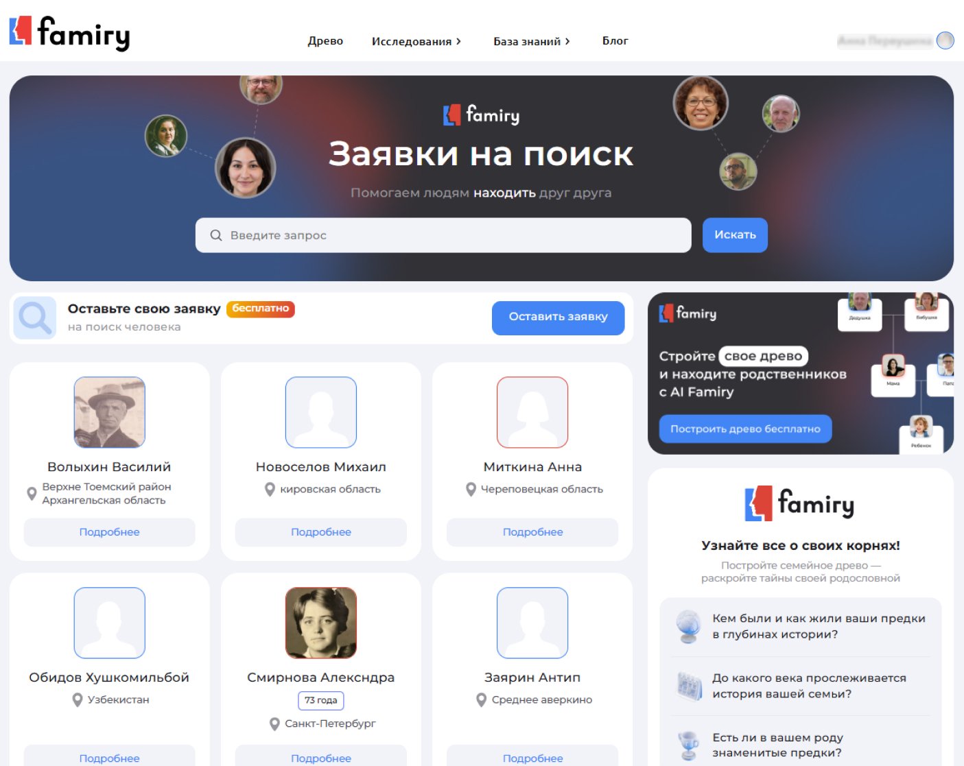 Страница сервиса "Найдем вместе" от Famiry с публичным каталогом сведений о людях, которых ищут
