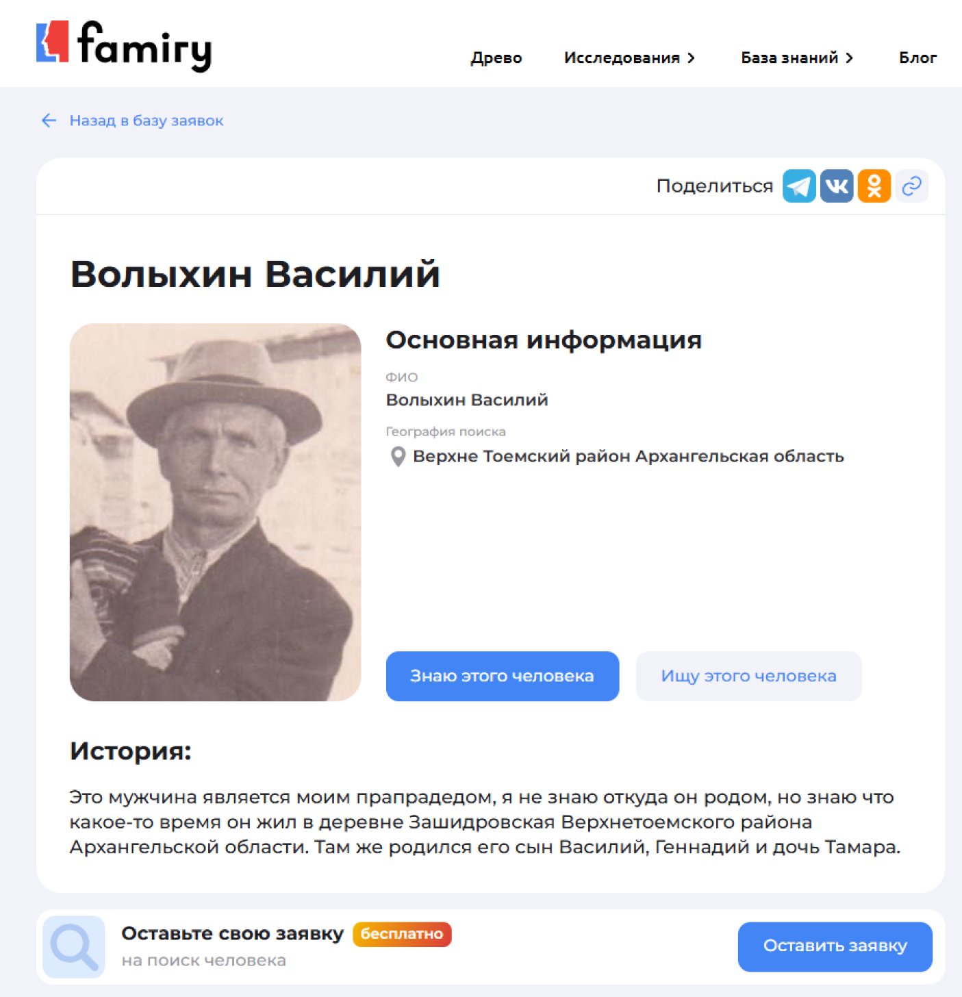 Страница со сведениями о разыскиваемом человеке в базе заявок Famiry. Здесь можно откликнуться, если вы можете помочь в его поисках.