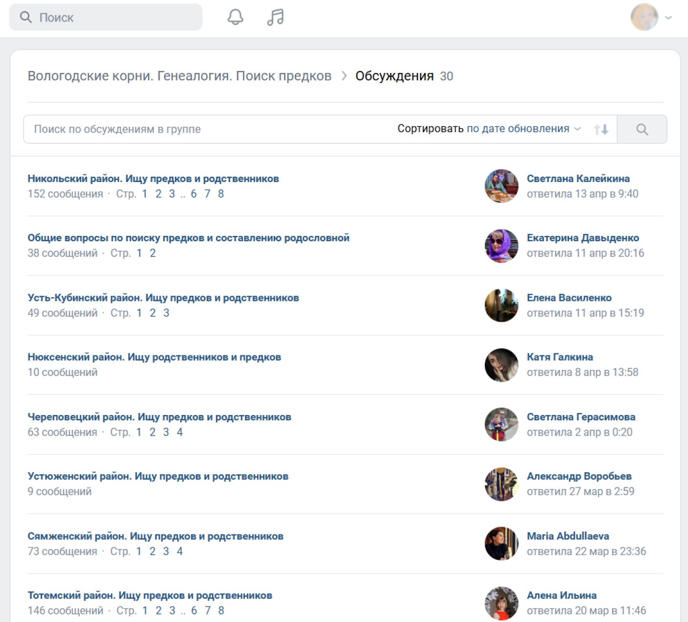 Ветки обсуждения по районам Вологодской области в группе ВКонтакте