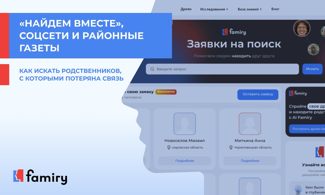 Порой найти человека, даже несмотря на все технологии, которые нам доступны, бывает довольно сложно, особенно если информации о нем мало. Понимая это, команда Famiry находится в постоянном поиске новых решений. Надеемся, с нашей помощью ваши древа будут не только расти вглубь, но и расширять свои ветви, в том числе за счет вновь обретенных родственников.