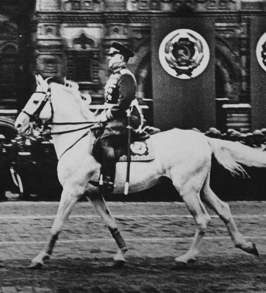 Парад Победы состоялся 24 июня 1945 г. и начался в 10 утра на Красной площади. Его принимал маршал Георгий Жуков, выехавший на белом коне Кумире — этот образ стал культовым. Командовал парадом маршал Константин Рокоссовский, который ехал на вороном коне — четкий визуальный контраст. О родословных Жукова и Рокоссовского читайте в статье «Жуков, Василевский, Рокоссовский: загадочные родословные советских маршалов» в блоге Famiry. После объезда войск Жуковым прозвучал гимн СССР в исполнении 1400 военных музыкантов, прогремели 50 залпов салюта.