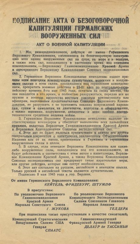 Документ. Листовка с сообщением о подписании Акта о безооговорочной капитуляции Германских вооружённых сил и об объявлении 9 мая праздником Победы / источник: Музей-заповедник истории Дальнего Востока имени В.К. Арсеньева (arseniev.org)