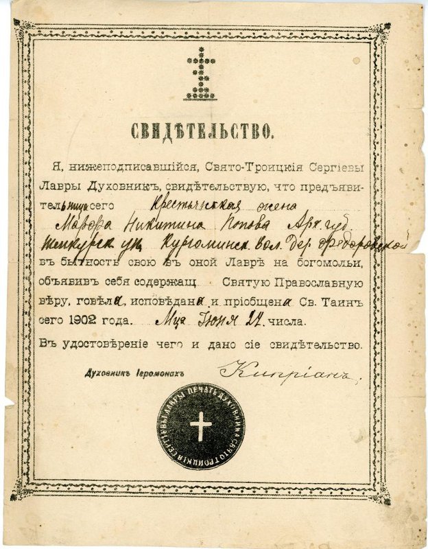 Свидетельство Марфы Никитичны Поповой о переходе из старообрядчества в православную веру. Выдано иеромонахом Свято-Троицкой Сергиевой лавры Киприяном, 1902 г. / источник: ГБУК Архангельской области “Каргопольский историко-архитектурный и художественный музей” (goskatalog.ru)