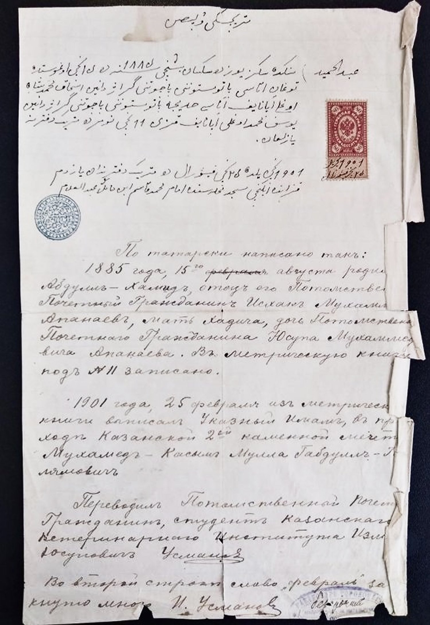 Выписка из магометанской метрической книги о рождении Абдул-Хамида Исхаковича Апанаева с переводом, 1901 / источник: МБУК города Казани “Музейный комплекс города Казани”, (goskatalog.ru)