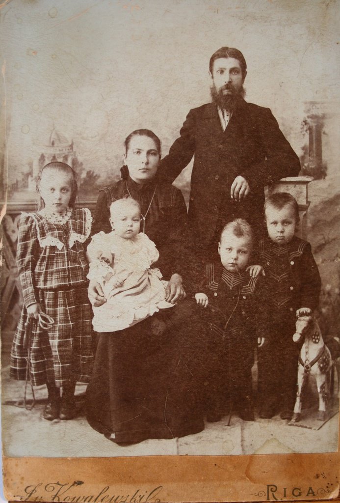 На фото Родион Петрович Кочетков с Александрой Алексеевной Каревой и детьми, Аграфеной, Варварой, Александром и Федором. Старообрядцы. Родион Петрович работал на фарфоровом заводе С. М. Кузнецова в Дулево и в Риге, 1904-1905, Рига / источник: И. Ковалевский, Архив Галины Кочетковой, История России в фотографиях (russiainphoto.ru)