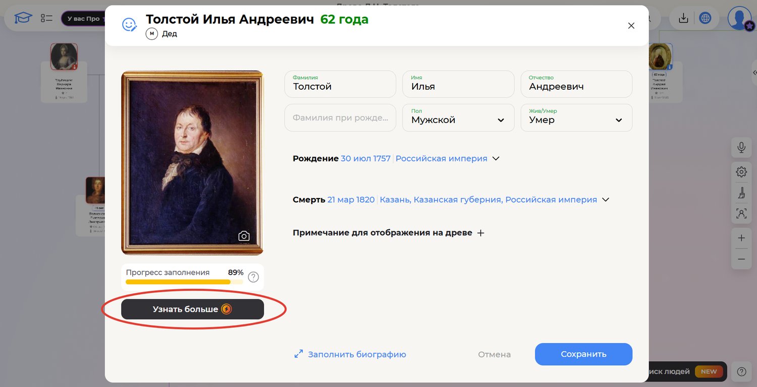 Кнопка "Узнать больше" о предке в семейном древе в сервисе Famiry