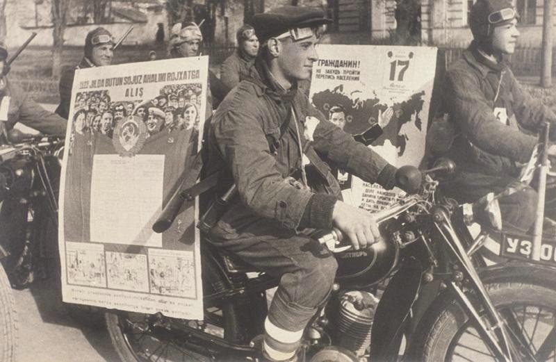 Мотоциклисты, пропагандирующие перепись населения, 1939, Узбекская ССР / источник: Макс Пенсон, МАММ / МДФ, История России с фотографиях (russiainphoto.ru)