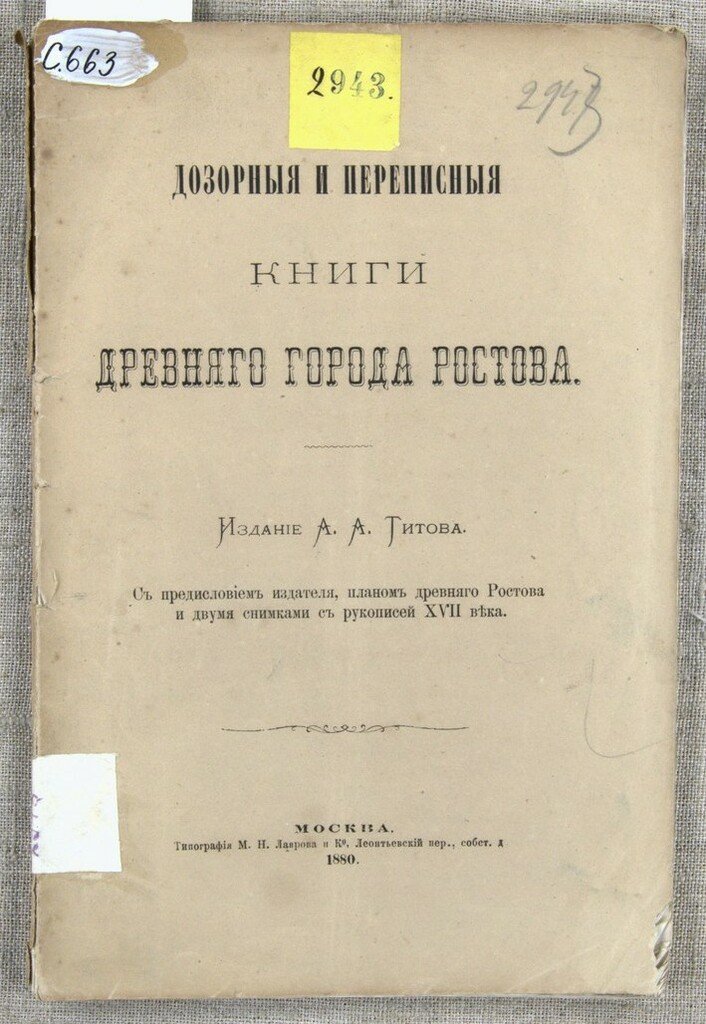 Дозорные и переписные книги древнего города Ростова. С предисловием издателя, планом древнего Ростова и двумя снимками с рукописей XVII века. Печать 1880 года / источник: А.А. Титов, ОГБУК “Костромской государственный историко-архитектурный и художественный музей-заповедник” (goskatalog.ru)