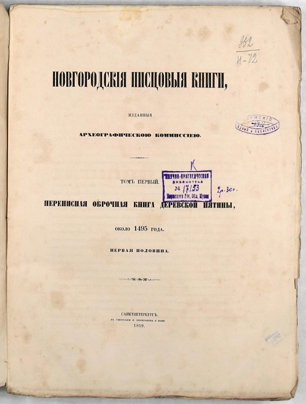 Новгородские писцовые книги. Переписная оброчная книга деревской пятины, около 1495. Печать 1859 года / источник: ГКБУК “Пермский краеведческий музей” (goskatalog.ru)