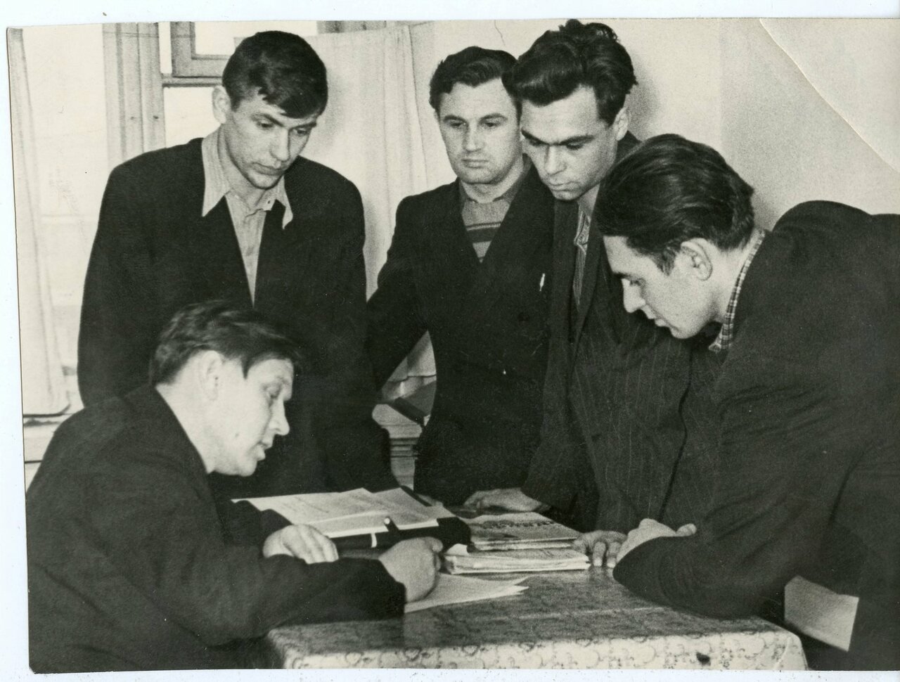 Перепись населения в г.Канске. Счетчик 1-го переписного участка преподаватель техн. училища Виктор Корнеевич Фохт вносит в переписной лист учащихся политехникума, 1959, Канск / источник: МБУК “Канский краеведческий музей” (goskatalog.ru)