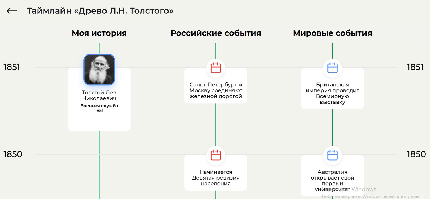 На странице "Таймлайн" в сервисе Famiry показаны события, произошедшие с вашими предками относительно общероссийских и мировых событий.