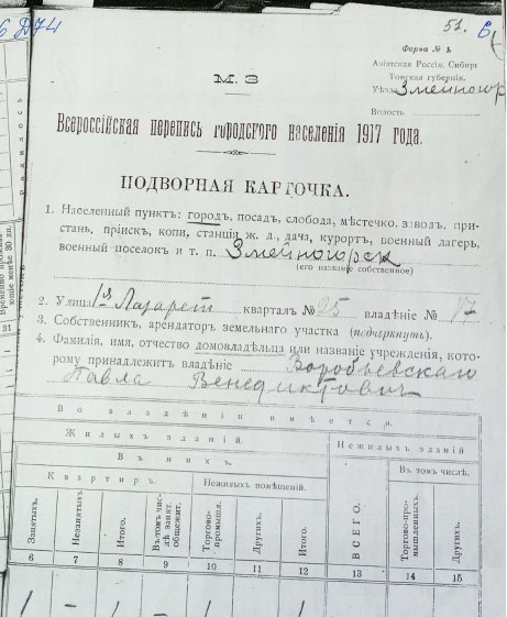 Подворная карточка Воробьевского П.В. Всероссийская перепись городского населения, 1917 / источник: МБУК “Музей истории развития горного производства имени Акинфия Демидова” Змеиногорского района Алтайского края (goskatalog.ru)