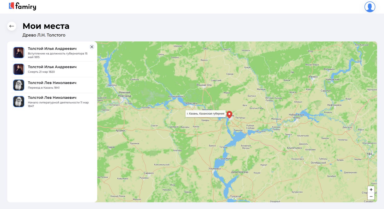Чтобы открыть карту с отмеченными на ней местами, нажмите кнопку «Мои места» на панели инструментов вверху или на панели меню слева. Здесь будут отмечены населенные пункты, которые связаны с теми или иными важными событиями в истории вашей семьи.