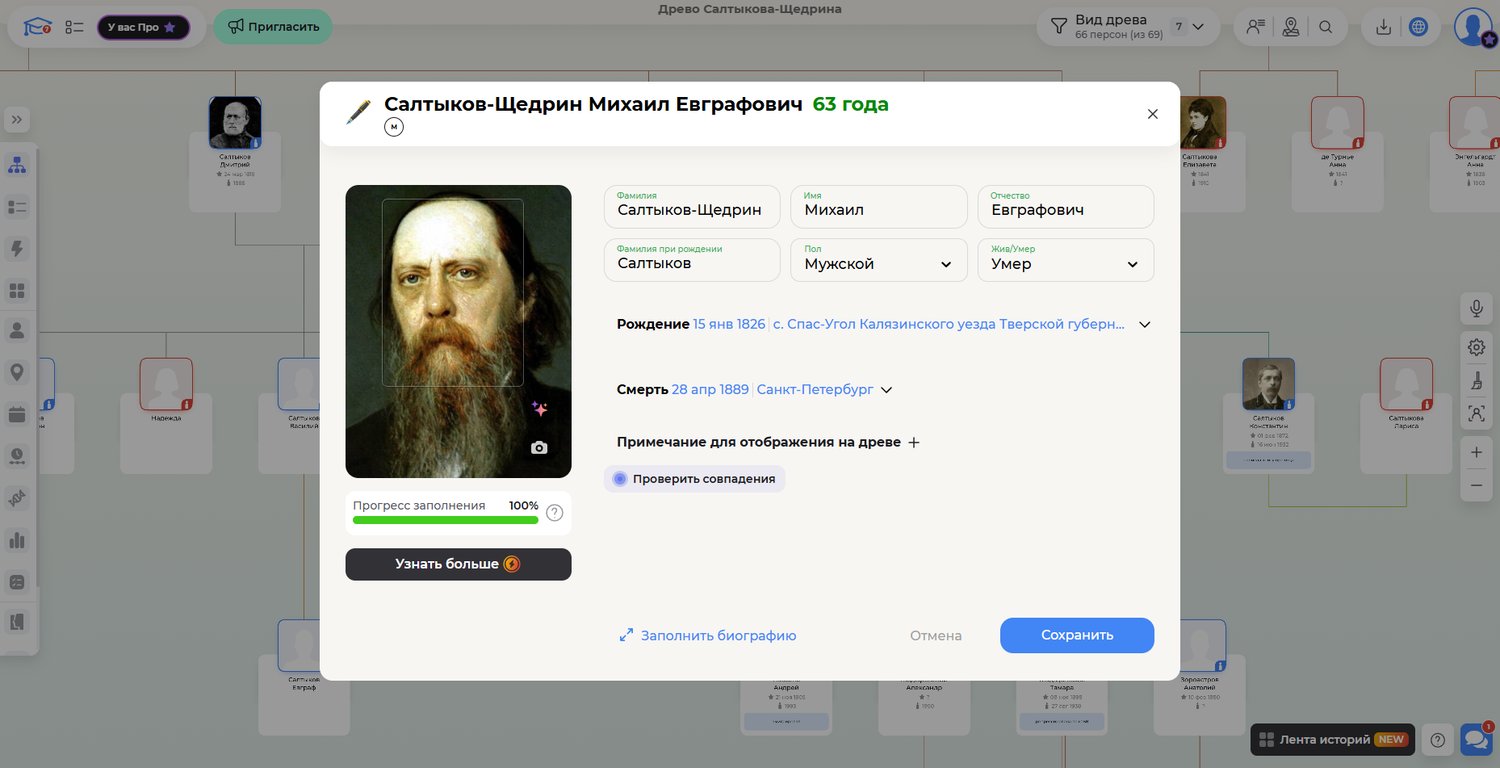 Фрагмент родословного древа Салтыкова-Щедрина на Famiry.ru