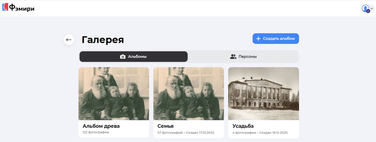 Когда вы добавляете фотографии в карточки персон, формируются отдельные альбомы для каждой из них. Персональный альбом находится в расширенной карточке во вкладке «Галерея».