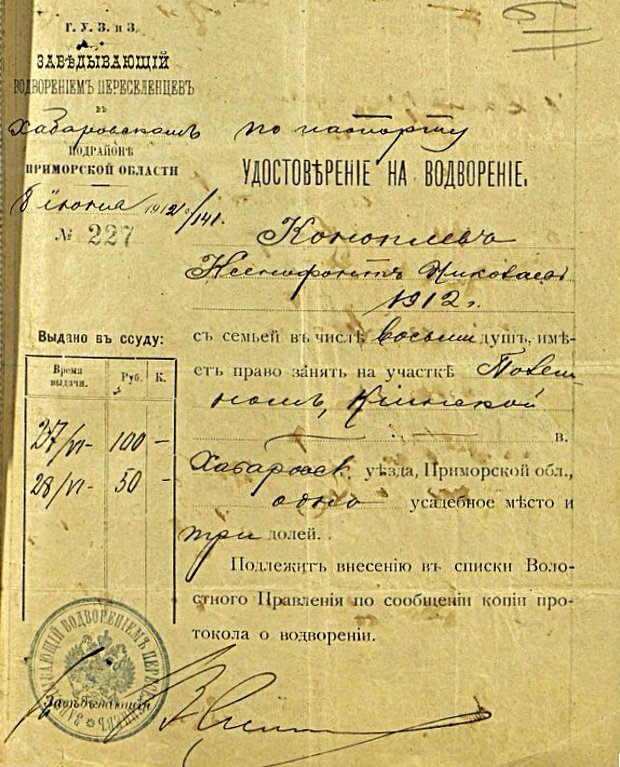 Удостоверение на водворение с указанием всех членов семьи прибывшего / Источник: ГА Хабаровского края (ГАХК), Ф. И6, Оп. 1, Д. 4