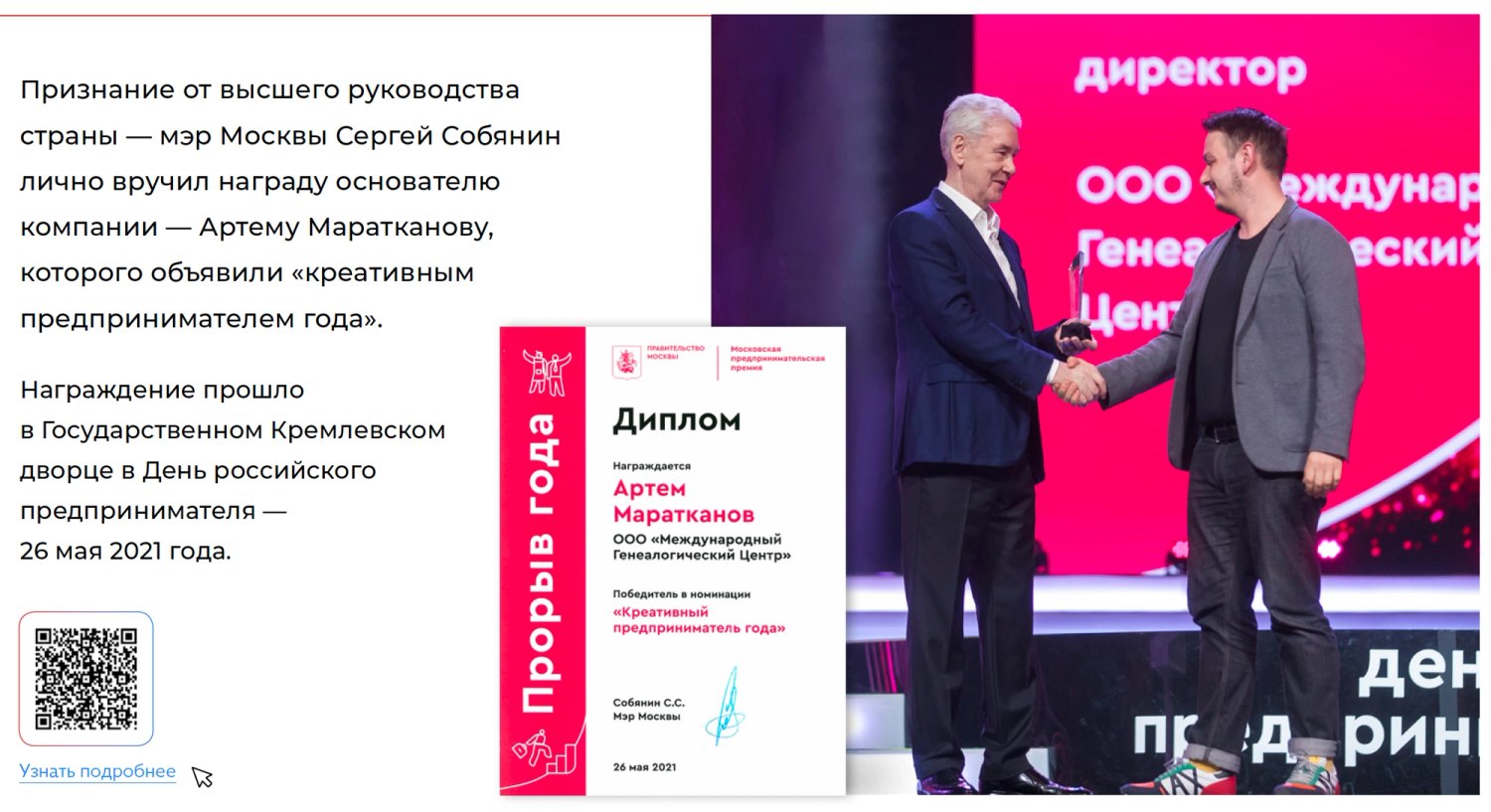 🔹 Победитель в номинации «Креативный предприниматель года» в премии «Прорыв года» — признание от высшего руководства страны — мэр Москвы Сергей Собянин лично вручил награду руководителю МГЦ, 2021 г.